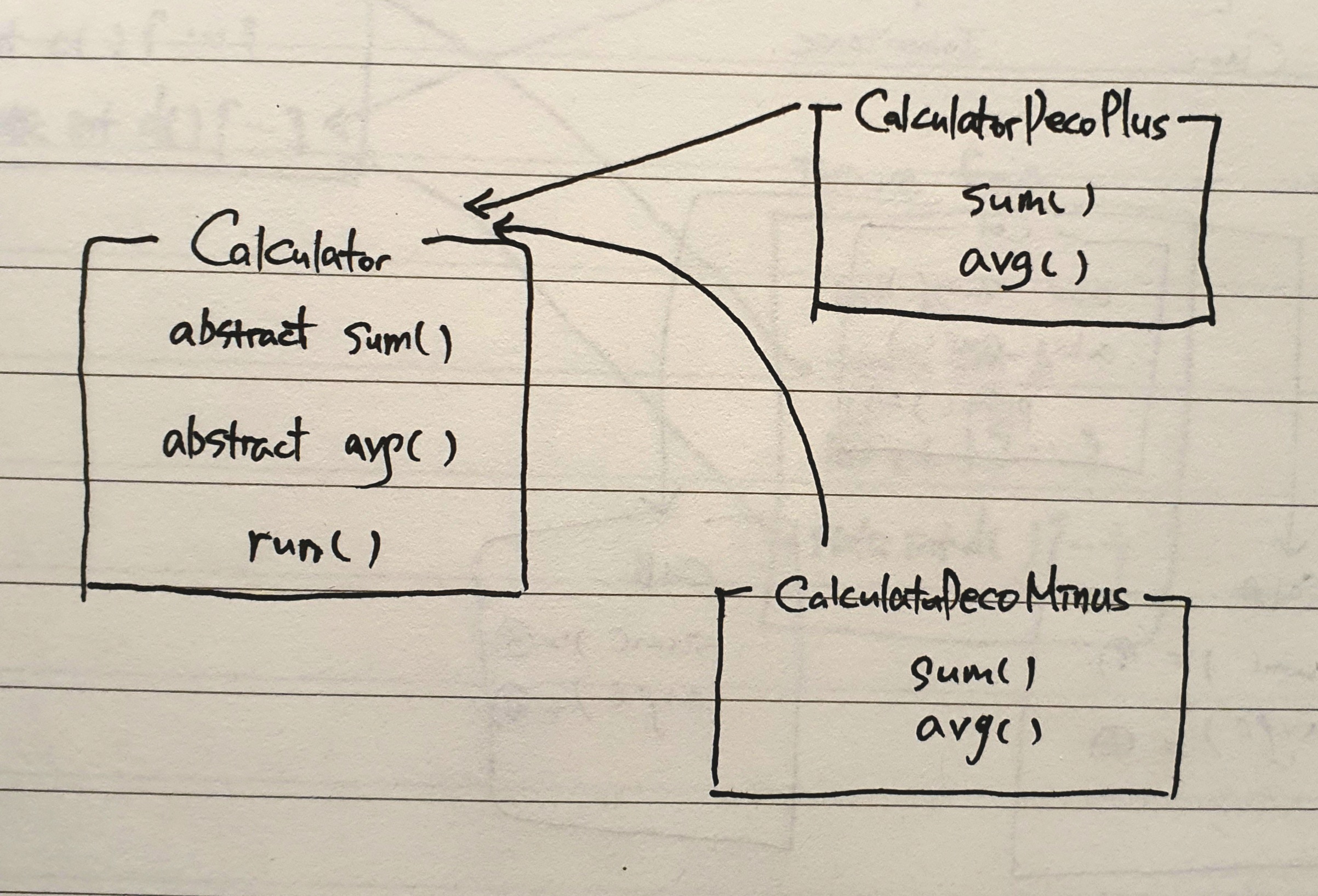 Calculator를 부모클래스로 둔 클래스로는 CalculatorDecoPlus와 CalculatorDecoMinus 클래스가 있다. 각각의 클래스는 sum과 avg를 자신의 특성에 맞게 정의하였다.