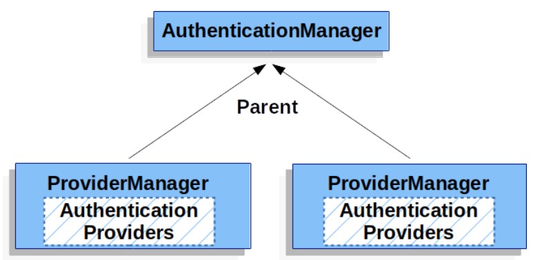 사실 다수의 ProviderManager 객체들은 같은 AuthenticationManager 부모를 공유할 수도 있습니다. 이는 공통 인증을 가지는 다수의 SecurityFilterChain 객체(공유 부모 Authentication)가 있을 뿐 아니라 다른 인증 메커니즘(다른 ProviderManager 객체)를 가질 때의 일반적인 현상이라 할 수 있습니다. (의역 - This is somewhat common in scenarios where there are multiple SecurityFilterChain instances that have some authentication in common (the shared parent AuthenticationManager), but also different authentication mechanisms (the different ProviderManager instances).)