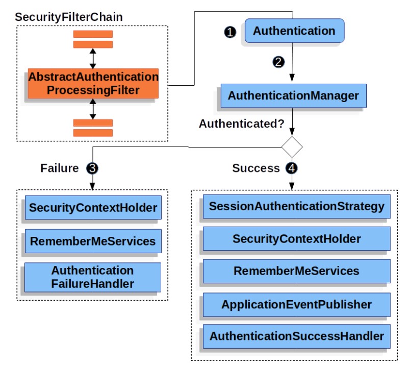 - AbstractAuthenticationProcessingFilter - 인증에 사용되는 기본 필터입니다. 높은 수준(high level)에서의 인증 흐름과, 각각의 메커니즘이 함께 동작하는 방식을 알 수 있습니다.