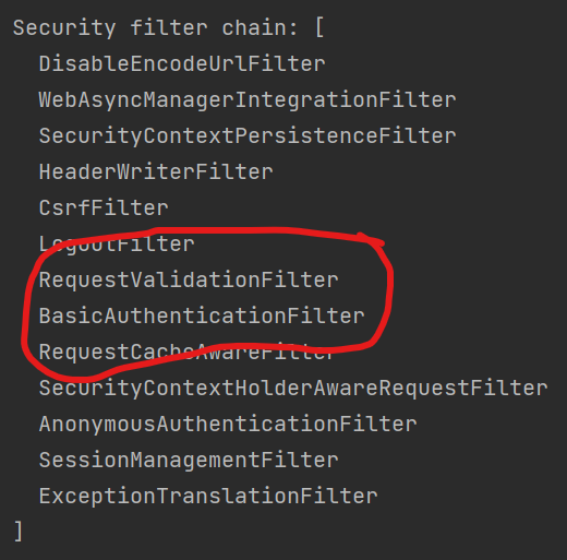 추가적으로 한 가지 살펴보도록 하겠습니다. 방금 예제에서 AuthenticationLogFilter의 위치는 분명 BasicAuthenticationFilter의 다음이었습니다. 그리고 우리는 이전의 테스트 요청에서 분명 BasicAuthenticationFilter가 우리의 커스텀 필터인 AuthenticationLogFilter 앞쪽에 위치해 동작하고 있다는 것을 확인했습니다.
