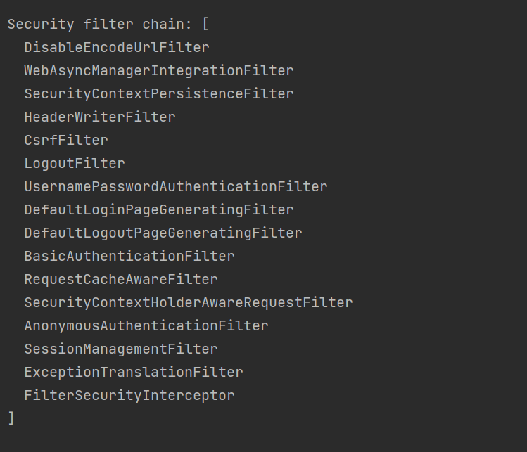 연습: 전 글에서 배운 csrf 필터를 비활성화하는 방법을 사용해 csrf를 비활성화 한 후, 다시 프로젝트를 돌려 적용된 필터를 확인해 봅니다. 위의 캡처에는 보이는 CsrfFilter가 없어진 것을 알 수 있습니다.