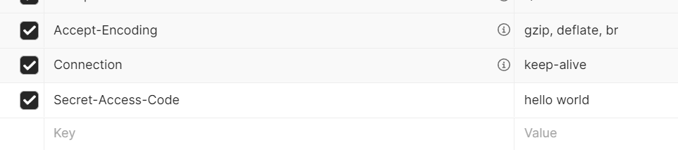 이번엔 다시 포스트맨을 켜신 후 지난 예제처럼 Headers 탭 내부에 Secret-Access-Code를 이름으로 하는 헤더를 생성합니다. 그리고 임의의 값을 넣습니다. 저는 hello world라는 값을 적었습니다.
