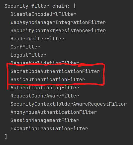 .addFilterAt(new SecretCodeAuthenticationFilter(), BasicAuthenticationFilter.class);