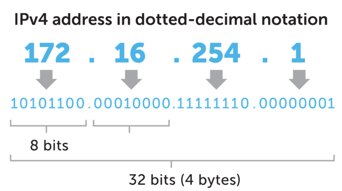 IPv4는 32bit 주소 체계를 사용하며 주로 8bit를 4개로 나누어 가운데 점(.)을 두어 각각의 8bit를 구분한다. 8bit는 비트 값으로 0000 0000인 십진수 숫자 0부터, 비트 값으로 1111 1111인 십진수 숫자 255까지 총 256개의 경우의 수를 가지고 있어 IPv4 주소체계로 표현할 수 있는 모든 주소의 수는 256의 4제곱이 된다.
