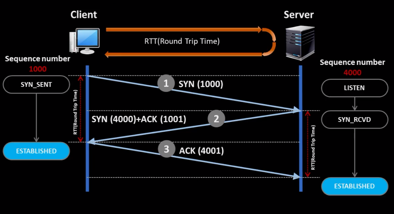 3-ways handshaking은 TCP가 클라이언트와 서버의 연결을 수립하는 과정이며, 통신이 총 세번 왔다 갔다 한다고 해서 3 ways handshaking이라고 함.